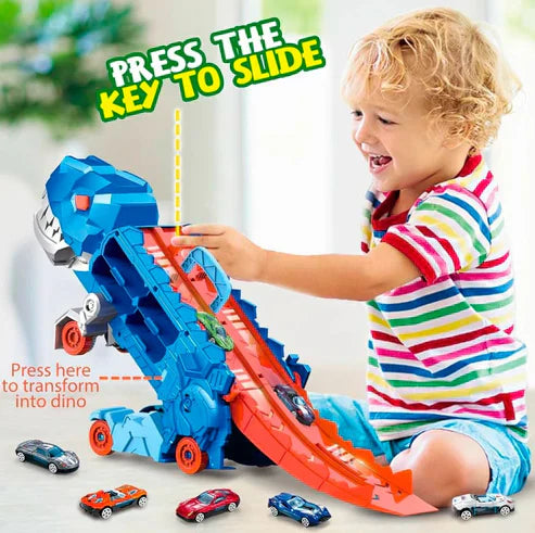 Transport Dinosaur Truck with Foldable Sliding 25-Inch Race Track, Transforms into Standing T-rex, Stores 12 1:64 Die-cast Toy Cars, Toys for 3 4 5 6 7 8 Years Old Kids Boys&Girls.
